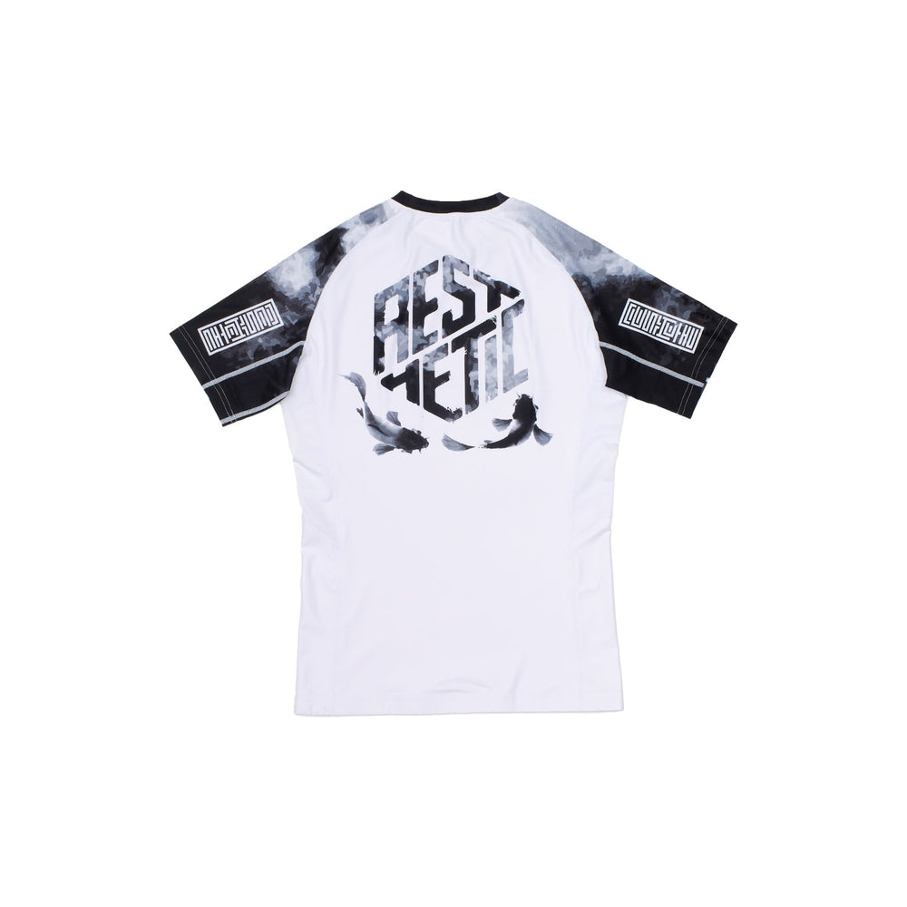 Inspired by the beautiful monochromatic East Asian ink wash paintings, the Sumi-E rashguard features sublimated brush-like detailing throughout, this time on white.
